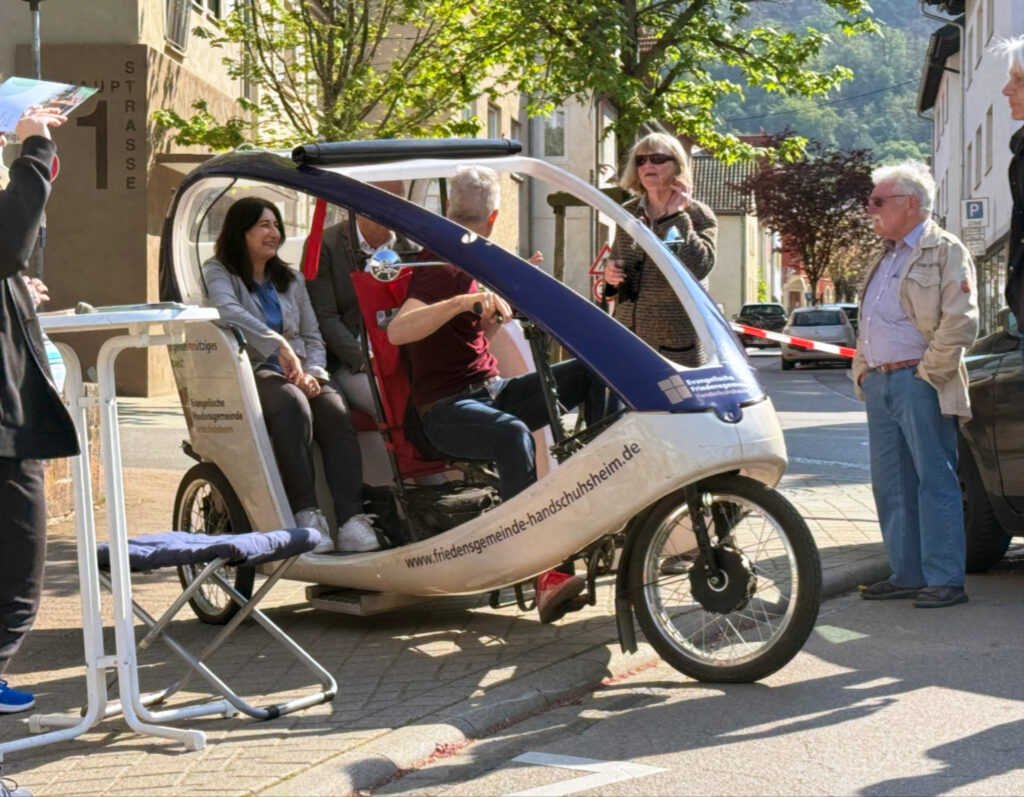 Neu war hingegen eine elektrisch unterstützte Fahrradrikscha, die für Probefahrten bereitstand. Ein solches Gefährt, wie es die Friedensgemeinde Handschuhsheim seit einiger Zeit nutzt, um mobilitätseingeschränkten Menschen Ausfahrten ins Grüne und anderswohin zu ermöglichen, wird es bald auch in Dossenheim geben. Auf Initiative von Annika Nordmann vom Seniorenbüro der Gemeinde und unterstützt von der Gruppe Bürger für Bürger wird dieses Angebot in Ergänzung zum Bürgerbus, der diesmal aus Termingründen nicht dabei sein konnte, die nachhaltige Mobilität und den gesellschaftlichen Zusammenhalt in Dossenheim weiter stärken. Wir danken Herrn Schimpf von der Friedensgemeinde für die vielen Probefahrten am Samstagvormittag – unter anderem auch mit unserer Landtagsabgeordneten Fadime Tuncer und Bürgermeister David Faulhaber.