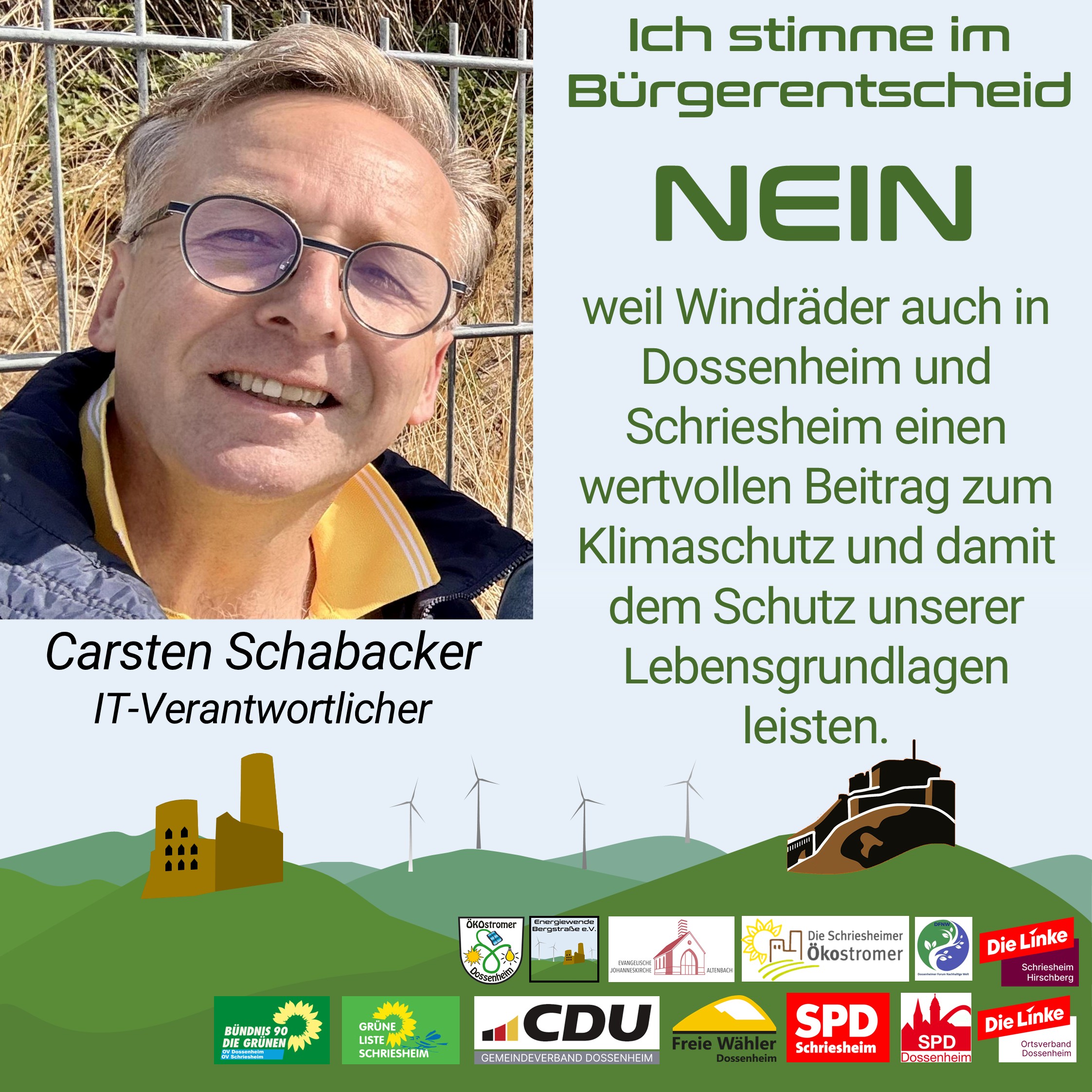 Am 9. November ist in Dossenheim und Schriesheim der Bürgerentscheid zum Bau von Windkraftanlagen. Diesen haben die Windkraftgegner initiiert, weswegen man „NEIN“ ankreuzen muss, wenn man FÜR Windkraft, Klimaschutz, Zukunftsfähigkeit und Verantwortung ist. Wir rufen Sie an dieser Stelle auf: Nutzen Sie Ihr demokratisches Recht und nehmen Sie an der Abstimmung teil, damit sie ein repräsentatives Bild dessen ergibt, was wir in Dossenheim für richtig halten.
